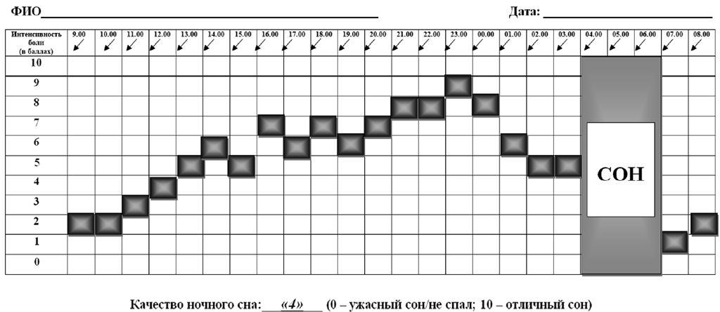 Важной характеристикой, оцениваемой с помощью суточного графического дневника боли, является оценка длительности и качества сна. Предложенный и использованный нами интегральный показатель оценки качества сна (индекс ночного сна ИНС) является одновременно простым в расчете и в достаточной мере информативным. Показателем «отличного» сна считали значения ИНС более 70 ед. (из расчета: произведение нормальной продолжительности сна >7 ч и 10 баллов качества сна по 10-балльной одномерной шкале оценке качества сна); «хорошего» — значения в диапазоне 49–69 ед., «удовлетворительного» — 28–48 ед., «плохого» — 7–27 ед., «неудовлетворительного» — менее 7 ед.
