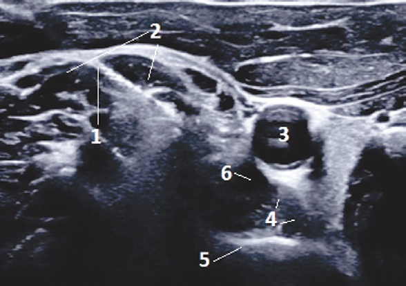 Рис. 4. Ультразвуковая навигация при выполнении блокады левого звездчатого ганглия. 1 — инъекционная игла; 2 — передняя лестничная мышца; 3 — общая сонная артерия; 4 — длинная мышца шеи; 5 — поперечный отросток 6-го шейного позвонка; 6 — звездчатый ганглий