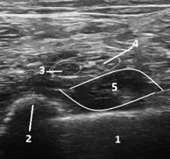 Рис. 6. Компрессия правого седалищного нерва костным отломком бедренной кости после огнестрельного многооскольчатого перелома: 1 — бедренная кость; 2 — костный отломок; 3 — малоберцовая порция седалищного нерва (гипоэхогенная структура, нервные фасцикулы не визуализируются); 4 — большеберцовая порция седалищного нерва (структура фасцикул сохранена); 5 — зона выраженного периневрального отека