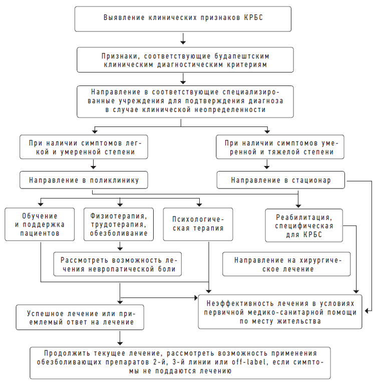 Выделяют 2 типа КРБС: КРБС I типа развивается при поражении любой этиологии, о КРБС II типа обычно говорят при развитии синдрома только после повреждения периферического нерва (подтвержденного по данным электронейромиографии или нейровизуализации). Однако варианты строения, особенно нервов верхних конечностей, могут давать неверную картину состояния периферических нервов и приводить к несвоевременной диагностике и лечению (таблица).