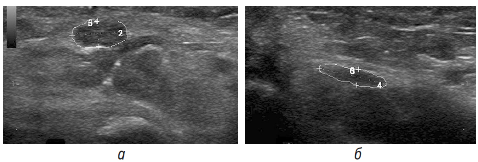 Рис. 2. а — УЗИ срединного нерва на уровне входа в запястный канал (поперечное сканирование); б — УЗИ правого срединного нерва при поперечном сканировании срединного нерва в карпальном канале