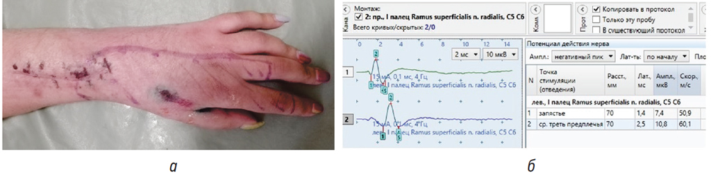 Рис. 3. а — Внешний вид левой кисти; б — ЭНМГ-параметры проведения электрического импульса по поверхностному лучевому нерву (в пределах возрастной нормы)