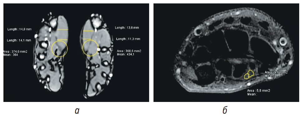 Рис. 4. Пациент Б; а — магнитно-резонансная томография (МРТ) кистей; б — МРТ левой кисти: желтым цветом выделены две порции срединного нерва
