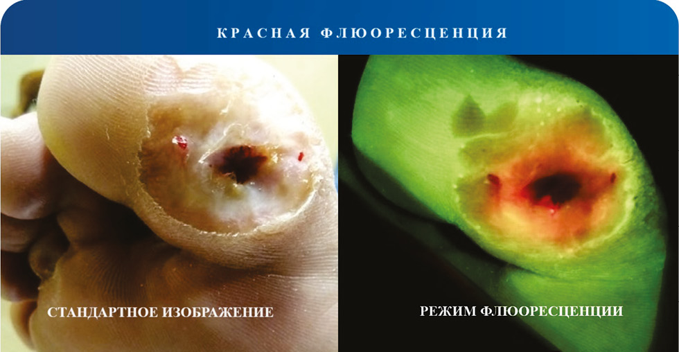Рис. 4. Фото раны стопы. Красная флюоресценция (стрелки) указывает на наличие и локацию колоний бактерий