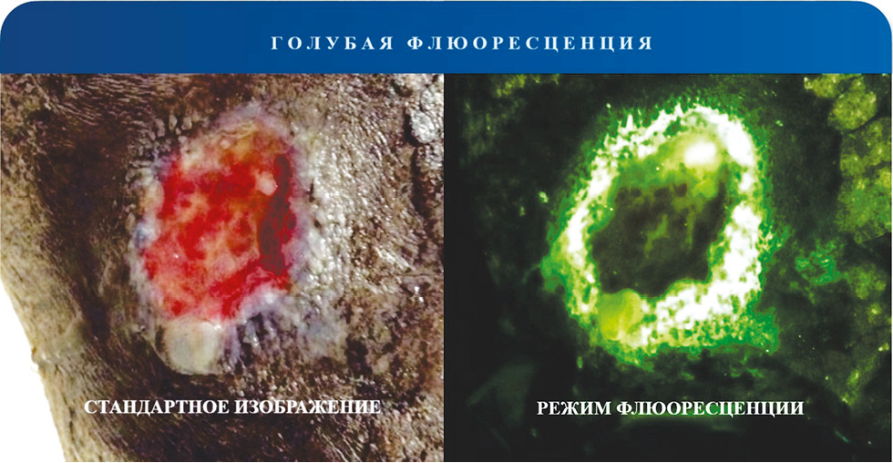 Рис. 5. Фото раны. Голубая флюоресценция (стрелки) указывает на наличие синегнойной палочки
