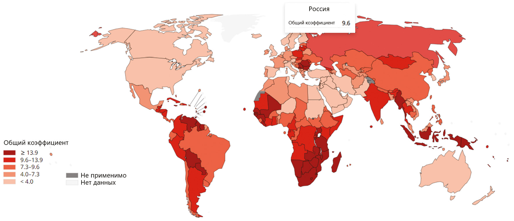 Рис. 1. Общий коэффициент смертности от РШМ в 2020 г. Источник: GLOBOCAN URL: https://gco.iarc.fr/en