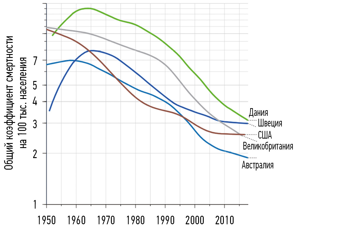 Рис. 2. Общий показатель смертности от РШМ на 100 тыс. на- селения в период 1950–2018 гг. в Дании, Швеции, США, Вели- кобритании, Австралии. Источник: GLOBOCAN URL: https://gco. iarc.fr/en