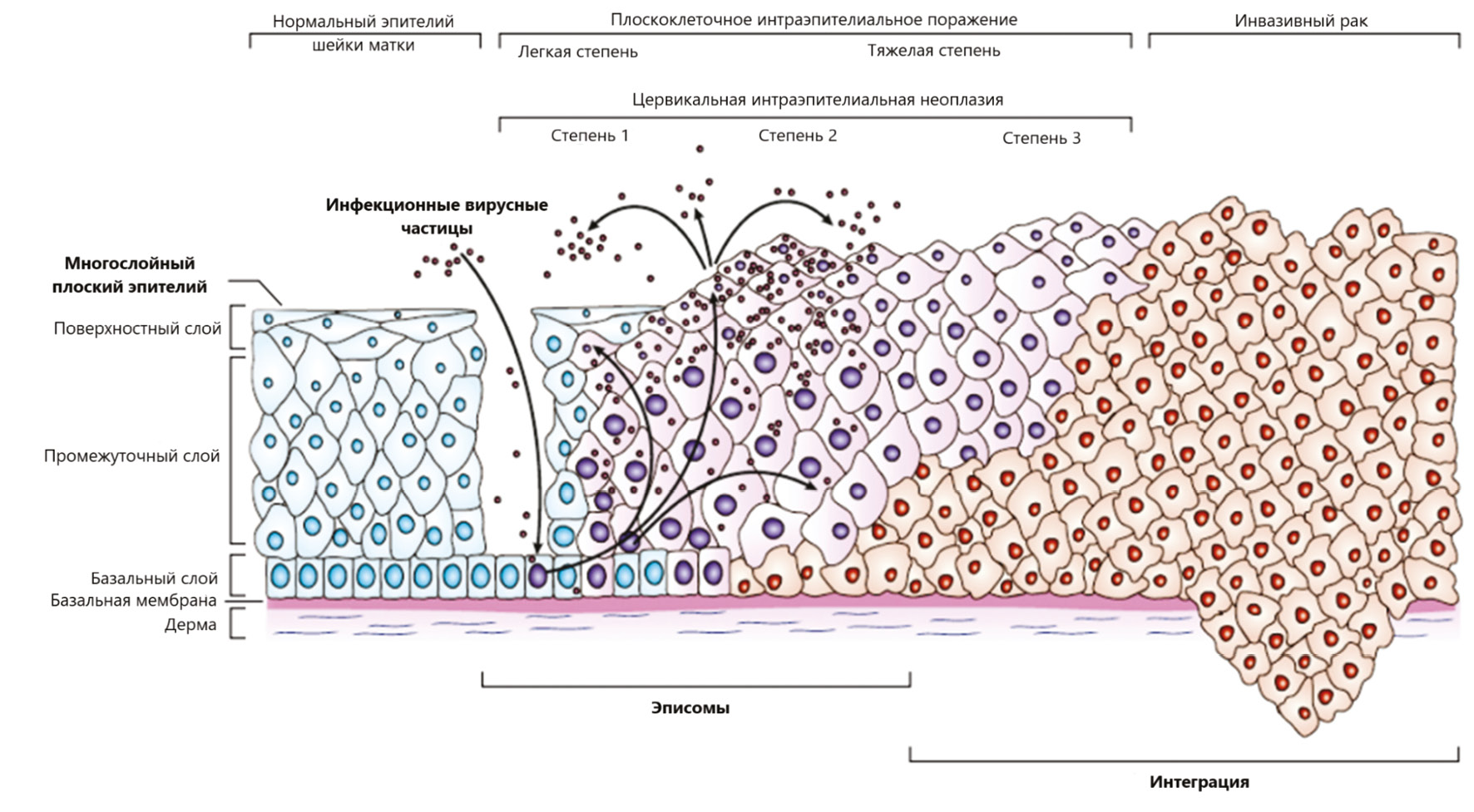 В зависимости от распространения патологического процесса внутриэпителиальное поражение плоского эпителия может быть легкой степени (что соответствует легкой дисплазии — CIN I) и тяжелой (CIN II, CIN III). На каждом из этих этапов возможна прогрессия или регрессия, при этом вероятность регрессии тем меньше, чем больше степень дисплазии. Для процессов инвазии, как правило, недостаточно просто персистенции ВПЧ, необходим ряд сопутствующих факторов риска, как неуправляемых, так и управляемых. Большую роль отводят иммунологической недостаточности, возникающей при совместном воздействии вирусных частиц и сопутствующих факторов: другие инфекционные заболевания, в том числе инфекции, передаваемые половым путем, ВИЧ-инфекция, беременность, трансплантация органов в анамнезе, иммунносупрессивная терапия [2, 7]. Существует ряд исследований, подтверждающих влияние курения и прием комбинированных оральных контрацептивов на опухолевую прогрессию [7, 8]. Имеются пока еще противоречивые данные в отношении бактериального вагиноза как фактора риска малигнизации [9].