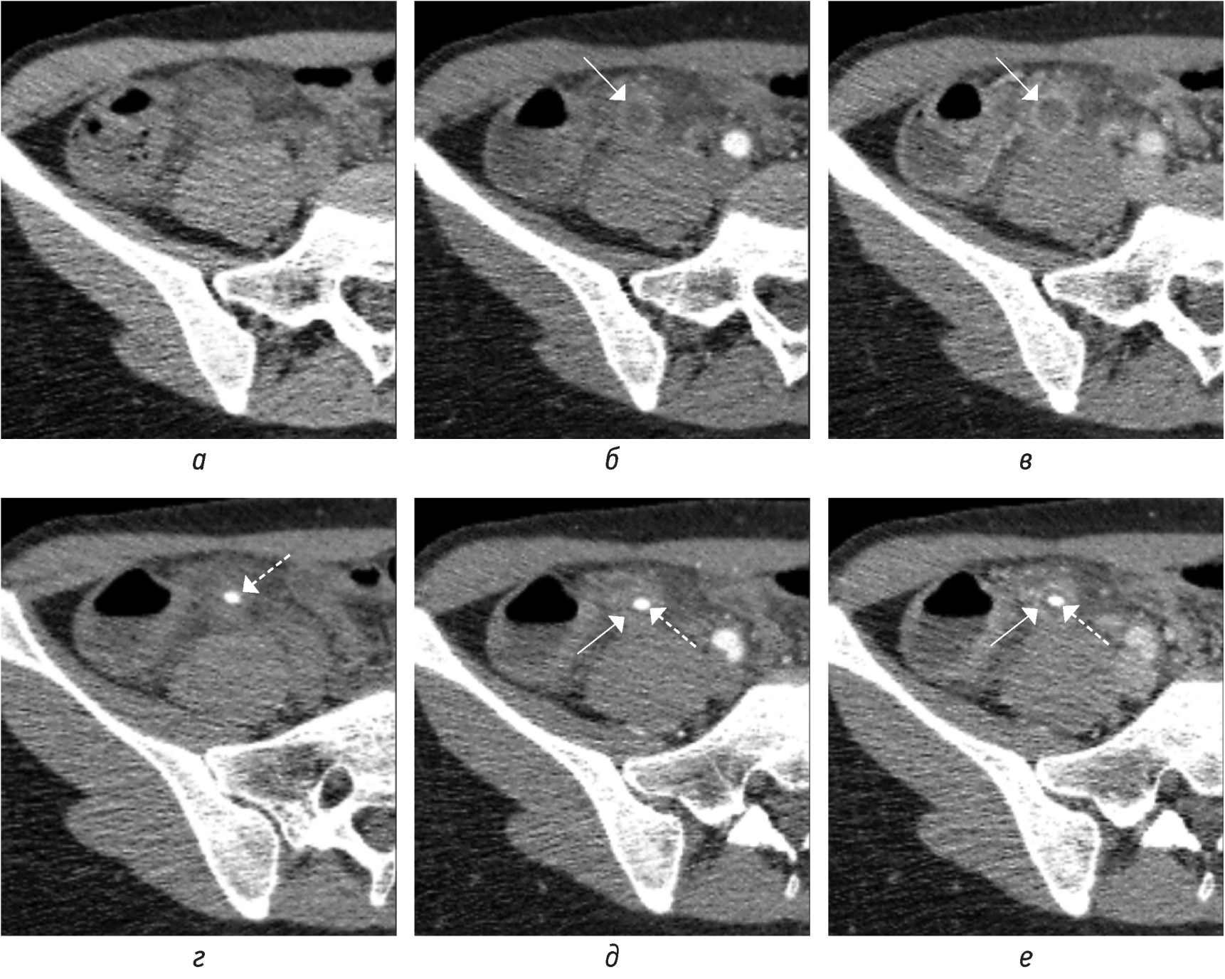 Рис. 1. На КТ-изображениях в аксиальной плоскости в нативную (а, г), артериальную (б, д), портовенозную (в, е) фазы на двух уровнях демонстрируется накопление контрастного вещества стенками аппендикулярного отростка (стрелка) в разные постконтрастные фазы в сравнении с нативной. В просвете аппендикса на фоне жидкостного содержимого визуализируется феколит (пунктирная стрелка)