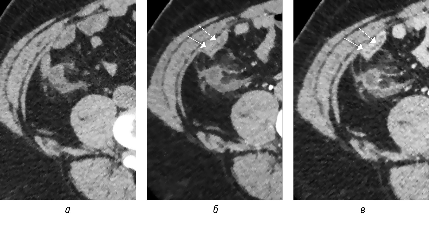 Рис. 2. КТ-изображения в аксиальной плоскости в нативную (а), артериальную (б), портовенозную (в) фазы демонстрируют (б, в) накопление контрастного вещества стенкой аппендикулярного отростка (стрелка) с более четкой дифференцировкой стенок от содержимого в просвете аппендикса (пунктирная стрелка)