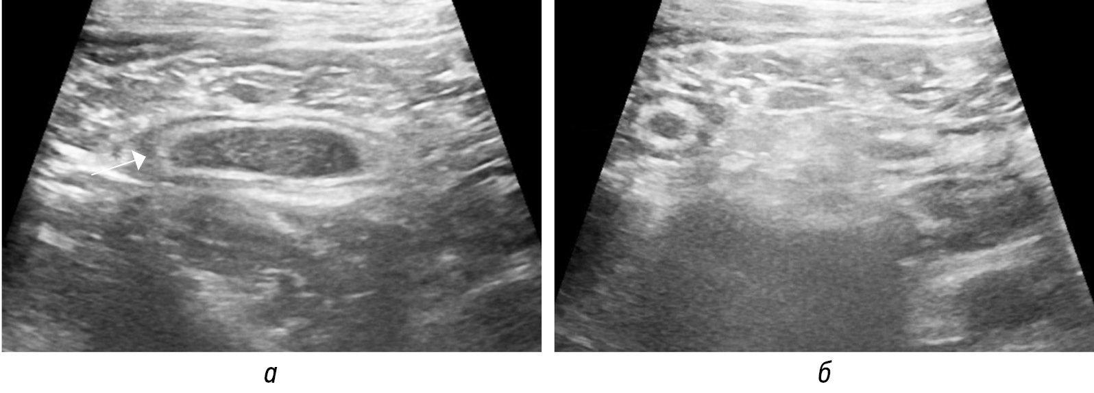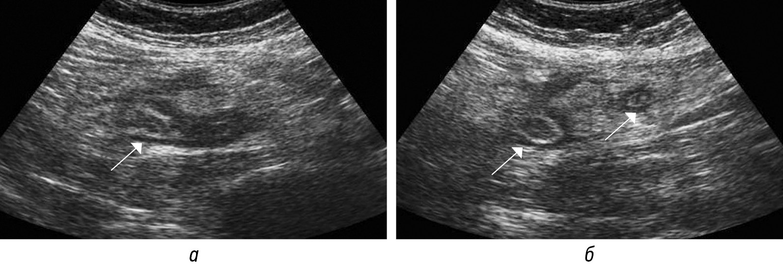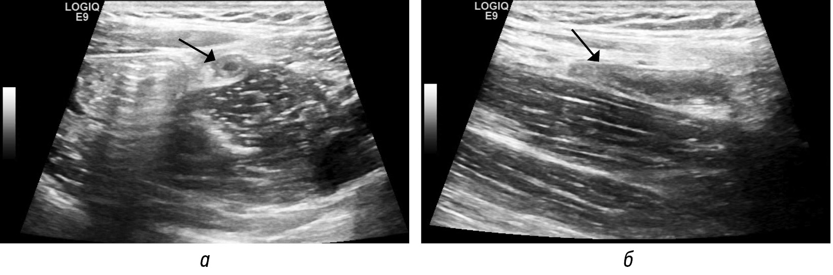 Рис. 3. Сонограммы воспаленного аппендикса (стрелки) в В-режиме по короткой (а) и длинной (б) осям
