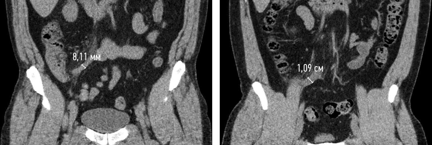 Рис. 4. КТ-изображения двух пациентов с острым аппендицитом во фронтальной плоскости в нативную фазу с указанием диаметров аппендикулярных отростков