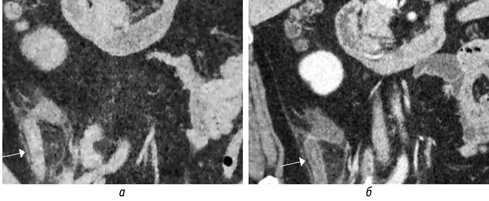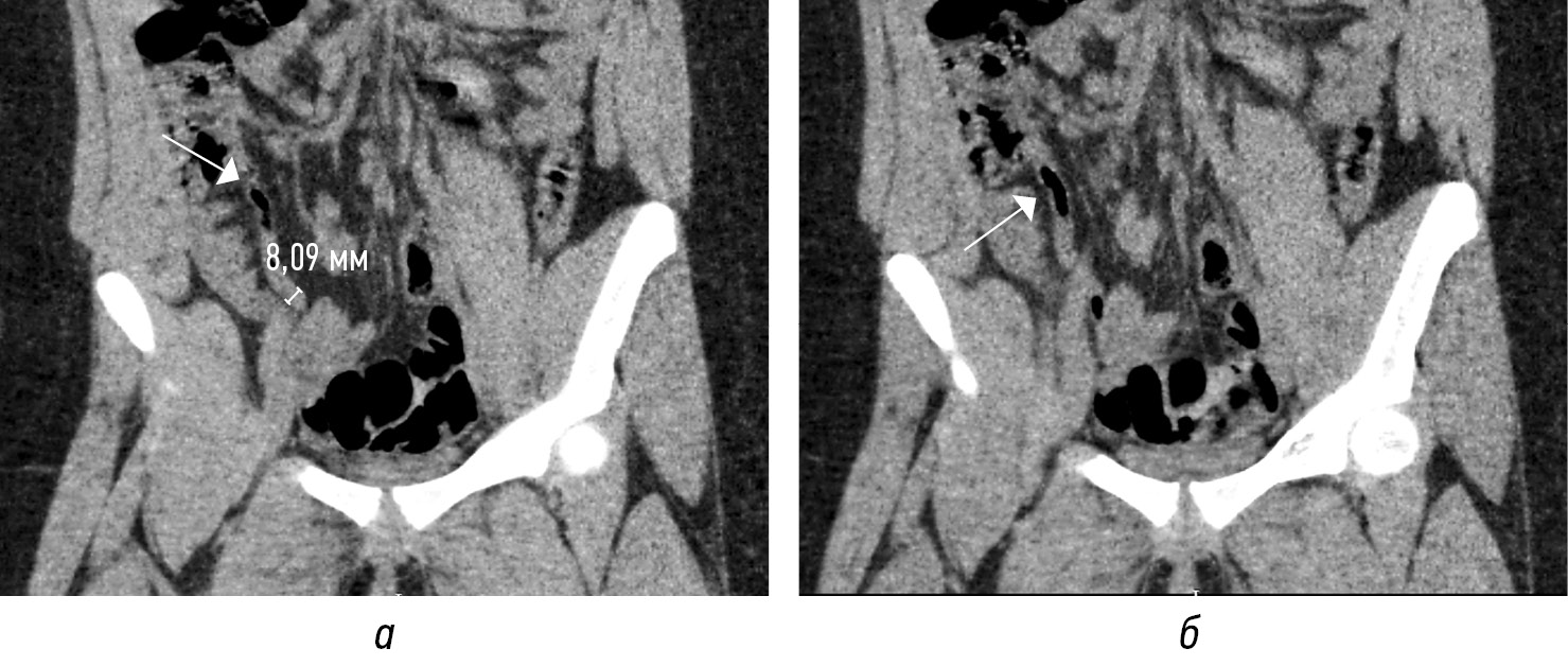 Рис. 5. КТ-изображения во фронтальной плоскости в нативную фазу (а, б) нормального аппендикулярного отростка с диаметром 8,09 мм и содержащим пузырьки газа (стрелки) без клинических признаков острого аппендицита