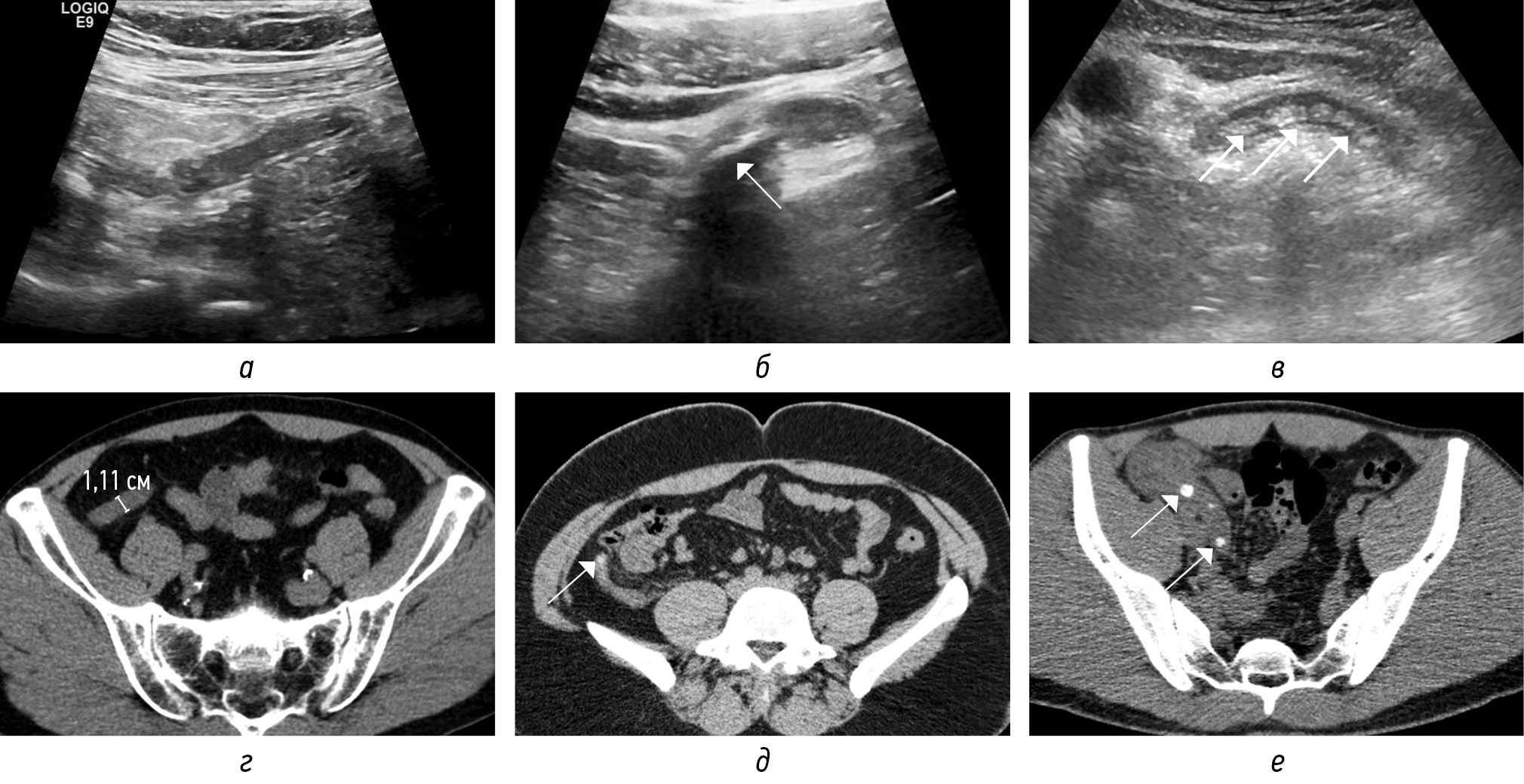 Fig. 6. Sonograms in B-mode along the long axis of appendixes (а–в), CT images in the axial plane in the native phase (г–е) only with liquid contents in the appendix (а, г), with a single appendicolitis (б, д), with multiple appendicolitis (в, е). Appendicolites are indicated by arrows