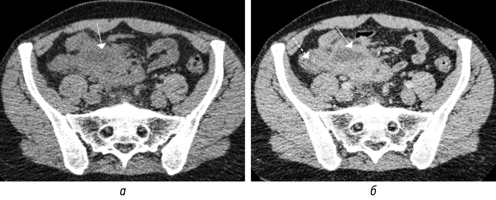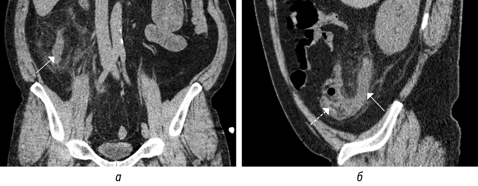 Рис. 7. КТ-изображения во фронтальной (а) и в сагиттальной (б) плоскостях в нативную фазу: вокруг аппендикулярного отростка (стрелки) тяжистое уплотнение жировой клетчатки. Купол слепой кишки (пунктирная стрелка)