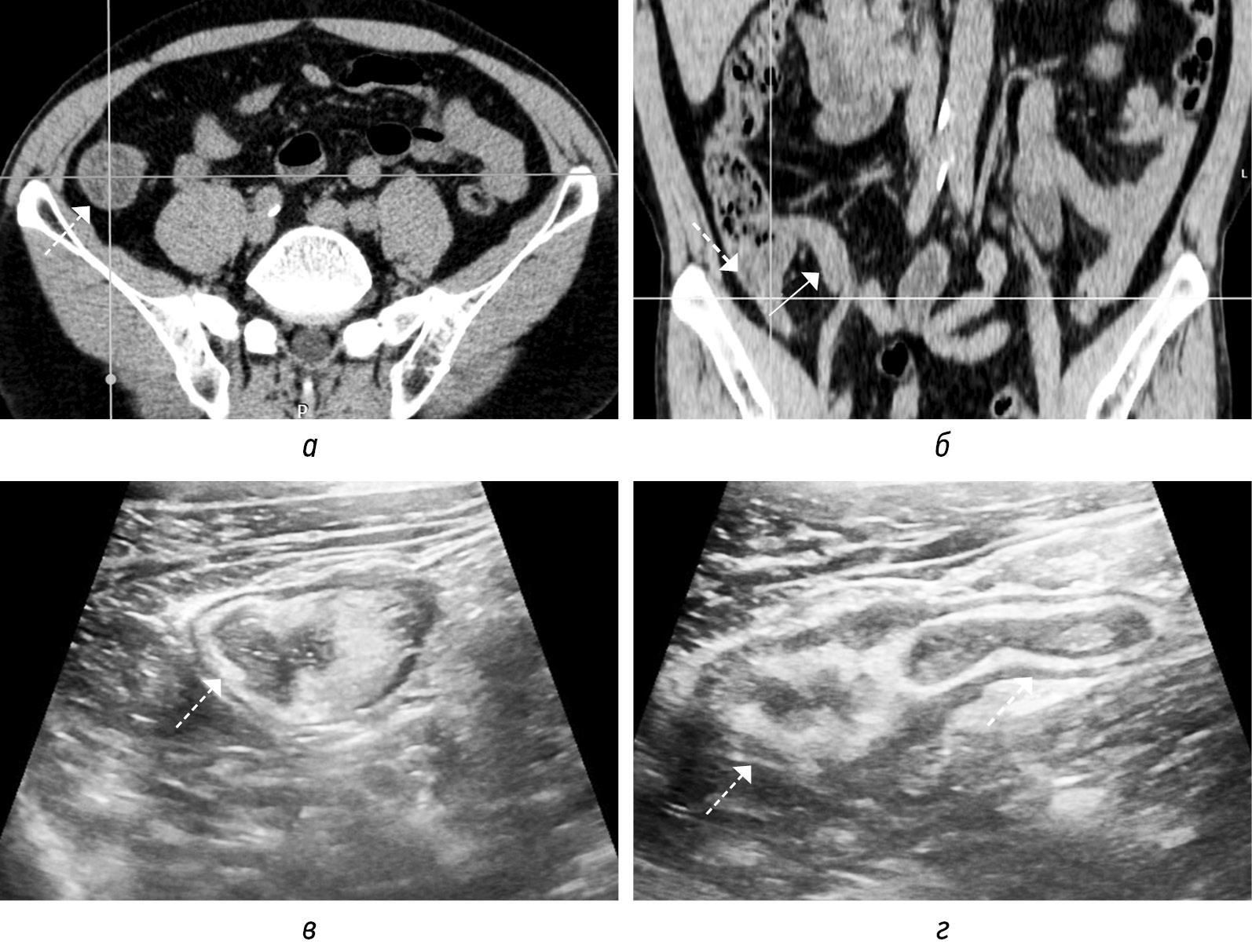 Рис. 9. На нативных КТ-томограммах в аксиальной (а) и фронтальной (б) плоскостях и соответствующих сонограммах (в, г) визуализируется аппендикс (стенки толщиной 4 мм, в просвете (до 6 мм) неоднородное содержимое) (стрелка) с отеком стенок слепой кишки (пунктирная стрелка). Прилежащая жировая клетчатка без видимых изменений