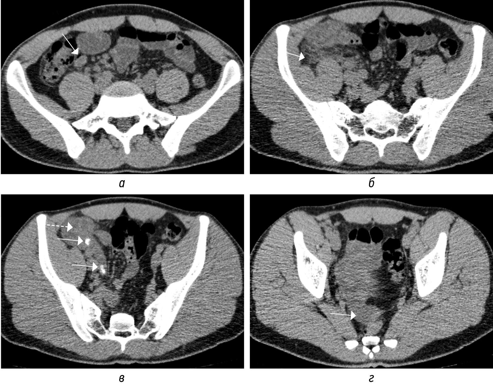 Fig. 11. Native CT-tomograms in the axial plane. Acute appendicitis with reactive regional lymphadenopathy (а, arrow), edema of the adjacent adipose tissue (б, arrow), with the presence of appendicolitis (в, arrow), thickening of the walls of the cecum (в, dotted arrow), small abdominal effusion (г, arrow)