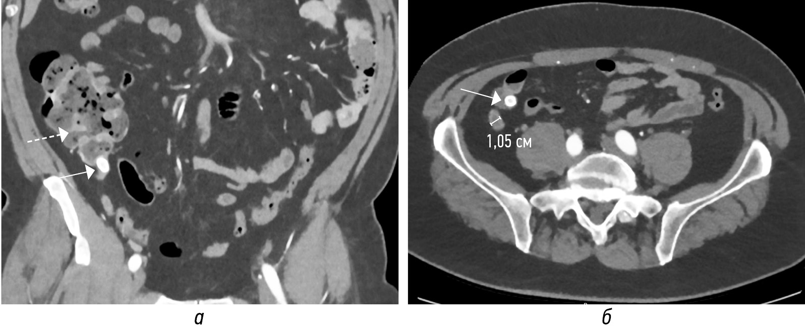 Рис. 12. КТ-изображения во фронтальной (а) и аксиальной (б) плоскостях в артериальную фазу. При КТ-ангиографии случайно выявлен аппендиколит в устье аппендикулярного отростка (стрелки) с увеличением диаметра аппендикса до 10 мм, без клинико-лабораторных данных за острое воспаление. Купол слепой кишки (а, пунктирная стрелка)