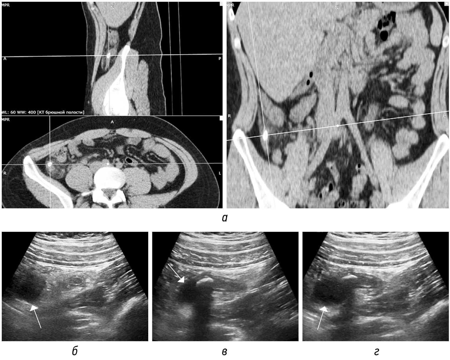 Рис. 15. КТ-томограммы (а) в трех плоскостях на уровне аппендикса с наличием в нижней трети аппендиколита (на изображениях соответствует точке пересечения секущих линий) с обструкцией просвета и расширением просвета выше препятствия, с отеком периаппендикулярной жировой клетчатки. Сонограммы (б–г) в В-режиме демонстрируют аппендиколит, участки аппендикса без расширения просвета и мешковидное расширение выше препятствия (стрелка)