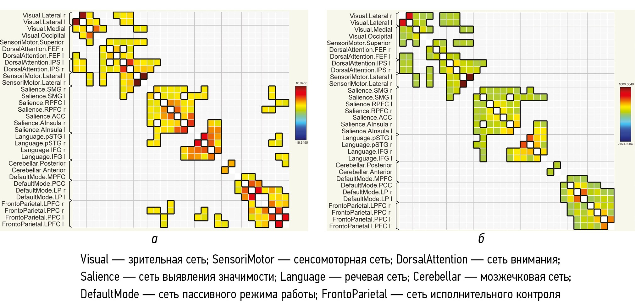 Fig. 2. Connectivity matrix using non-parametric statistics methods based on: а — randomization/permutation spatial pairwise clustering (SPC); б — threshold free cluster enhancement (TFCE)