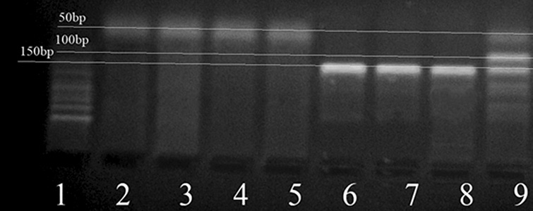 Fig. 4. Electrophoregram of PCR results on detection of mutation (A > C) in PfCRT gene (ApoI endonuclease) (1 — marker of lengths fragment length marker; 2–5 — negative control; 6–8 — wild plasmodium genotype (A); 9 — wild and mutant genotypes (A > C)