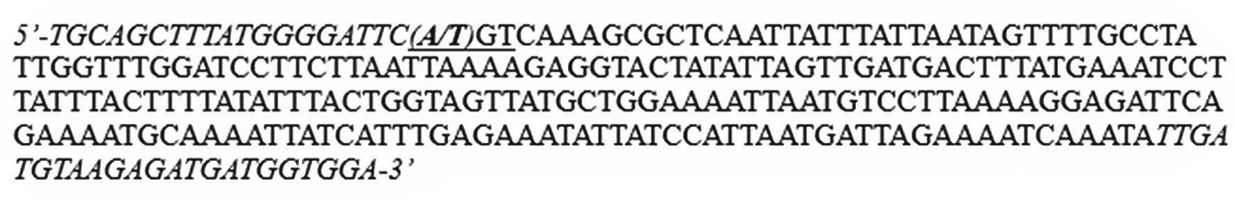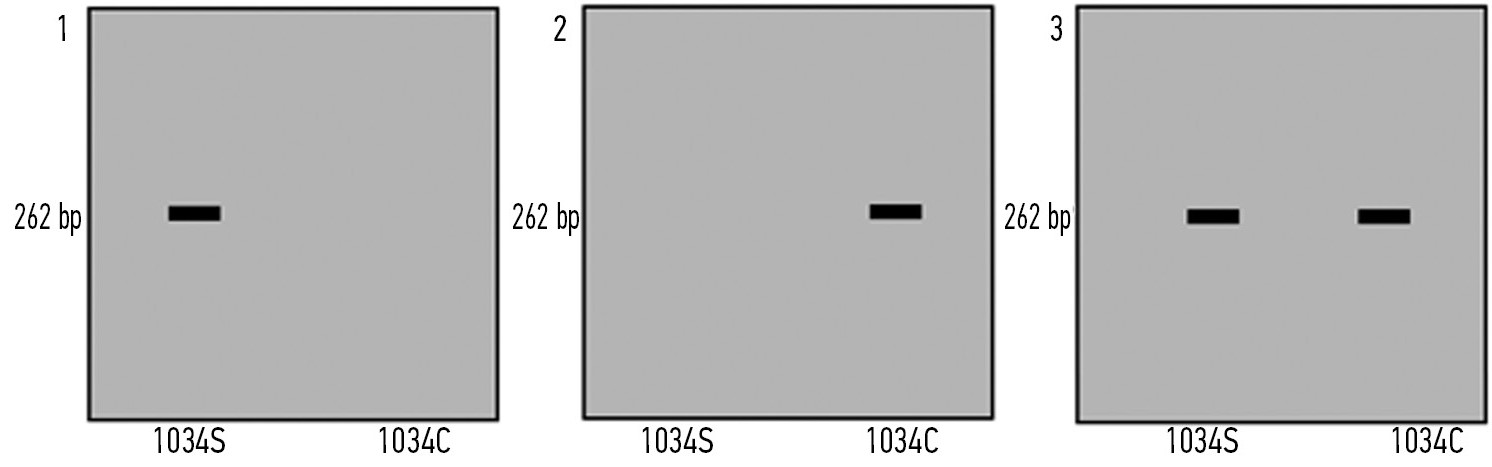 Для идентификации SNP (A > T) предлагается использовать технологию аллель-специфичной ПЦР. Эта технология основана на включении мутантного нуклеотида в последовательность праймера. Длина каждого праймера составляла 21–23 bp, а в 3' конце находились различные варианты анализируемого 1034-го кодона: 5'-GCAGCTTTATGGGGATTC (A/Т)-3'.