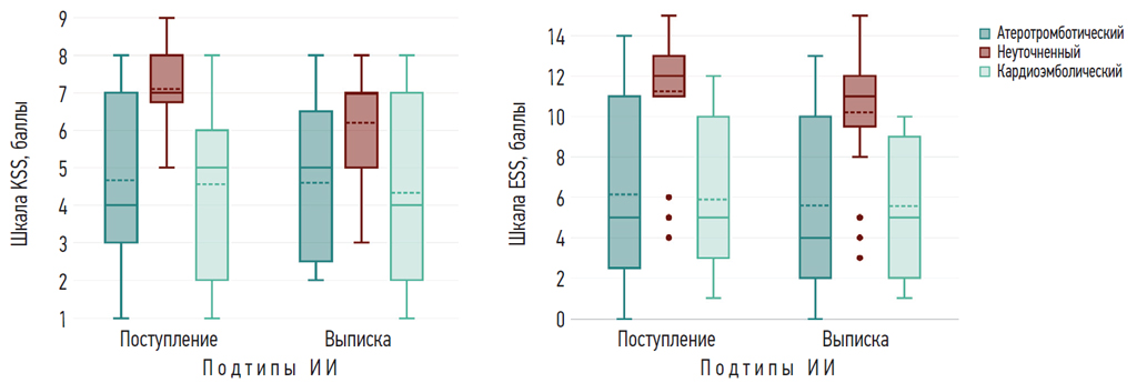 Fig. 1. Average values of the degree of sleepiness according to the ESS and KSS scales, depending on the subtype of ischemic stroke IS