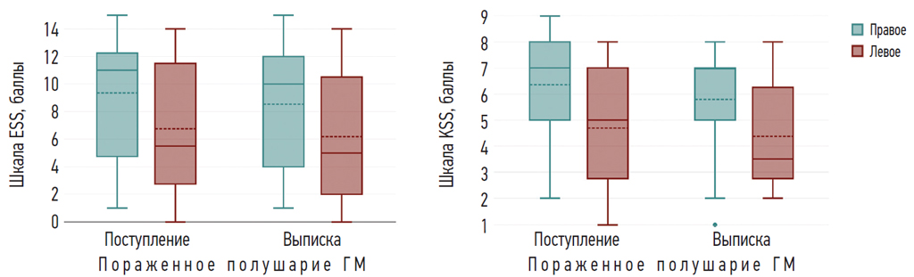 3. Fig. 2. Average values of the degree of sleepiness according to the ESS and KSS scales, depending on the affected hemisphere of the brain