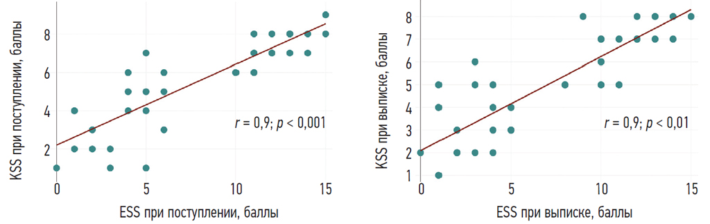 Рис. 3. График корреляции, характеризующий степень взаимосвязи показателей сонливости по Эпвортской и Каролинской шкалам