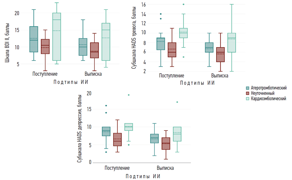 Рис. 4. Средние значения степени выраженности тревоги, депрессии и усталости в зависимости от подтипа ИИ