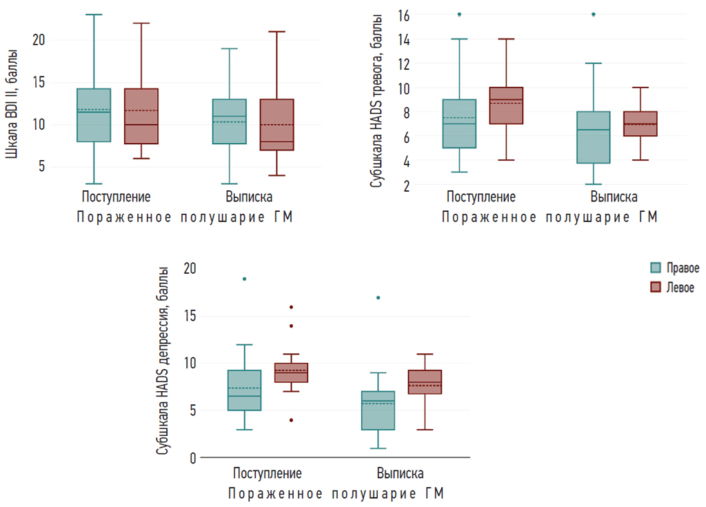 Оценка зависимости уровня тревоги и депрессии (BDI II, HADS) от подтипа инсульта показала, что достоверно более низкая степень эмоциональных расстройств отмечалась у пациентов с неуточненным подтипом ИИ (p < 0,05) (рис. 4); а при сравнении с локализацией очага инсульта степень выраженности депрессии по шкале депрессии Бека II была сопоставимой для обоих полушарий, однако по данным HADS (субшкалы тревоги и депрессии) у «правополушарных» пациентов нарушения эмоционального спектра были представлены в меньшей степени (p < 0,05) (рис. 5). Статистически значимая связь выраженности тревоги и депрессии с объемом очага и количеством эпизодов инсульта не была выявлена.