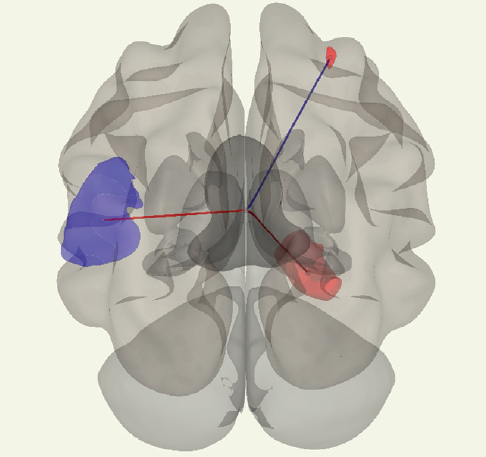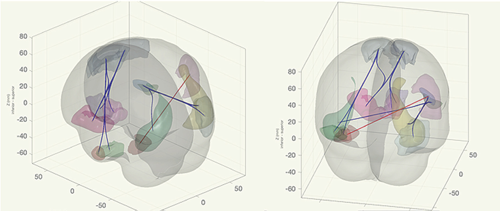 При кластерном анализе данных функциональной МРТ у пациентов I и II групп определялось усиление функциональных связей между задними отделами надкраевой извилины справа, височно-затылочной и веретенообразной извилинами слева; ослабление функциональных связей лобной коры и островка с латеральными зрительными отделами и нижним отделом латеральной затылочной коры справа; ослабление функциональных связей верхней лобной извилины с лобно-зрительной корой слева и медиальной лобной корой, подмозолистой извилиной, передними и задними отделами нижней височной извилины слева (рис. 6).