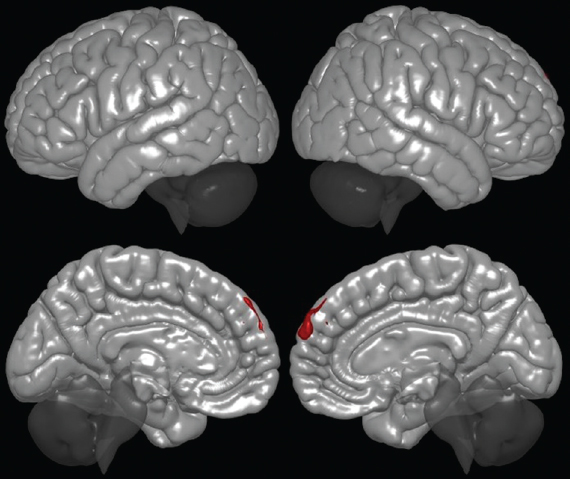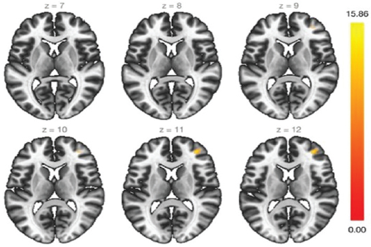 2 | +36, +46, +14 | 190 | 0.000100 | 0.000069 | 0.000002 | 0.974484 | 0.000027 | Right frontal lobe, right middle frontal gyrus |