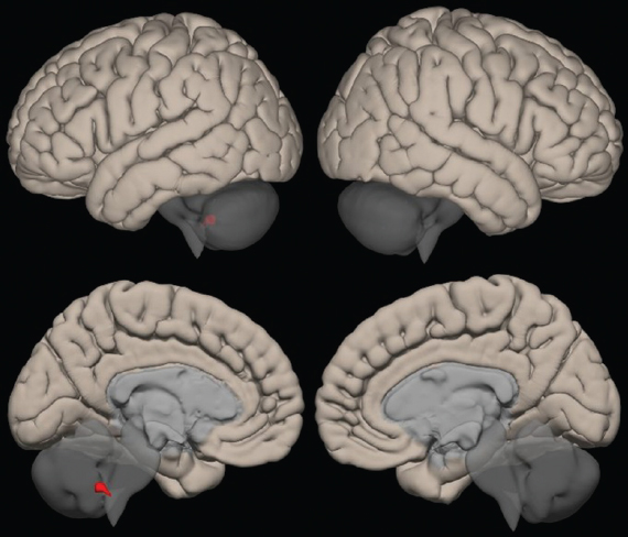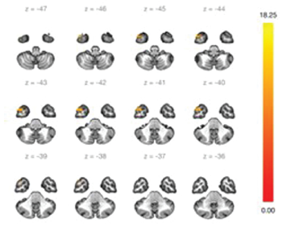 3 | +18, –50, –42 | 112 | 0.004425 | 0.002743 | 0.000090 | 0.123083 | 0.000001 | Right cerebellar hemisphere |