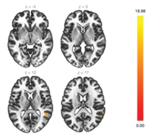 2 | –20, –70, +00 | 121 | 0.002707 | 0.002514 | 0.000055 | 0.477232 | 0.000003 | Left lingual gyrus, left intracalcarine cortex, left occipital fusiform gyrus |