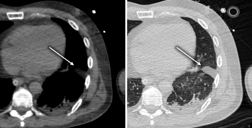 Рис. 2. КТ органов груди в аксиальной плоскости (слева — мягкотканное окно, справа — легочное окно). Пролабирование экстраплевральной клетчатки в междолевую щель (стрелки).