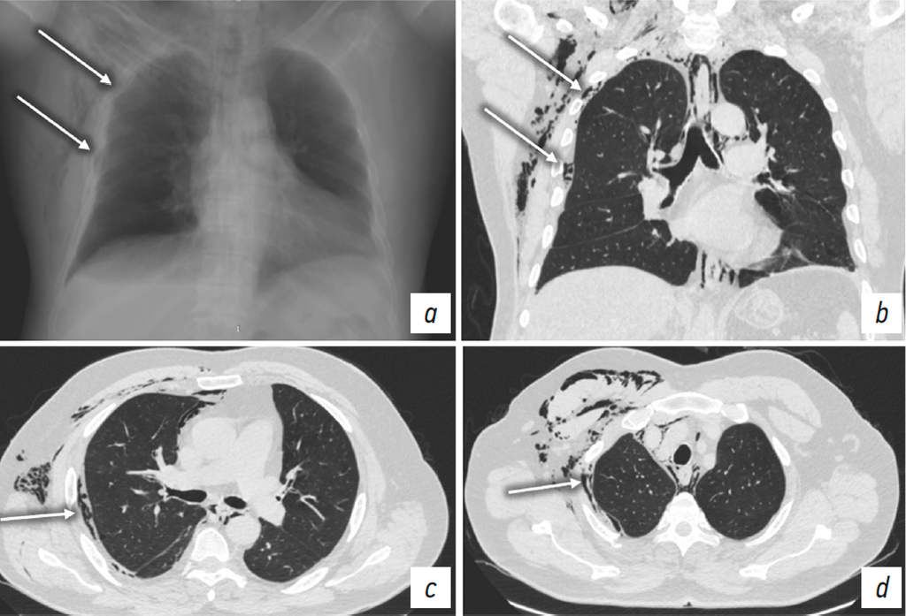 Fig. 3. Patient M. a, chest X-ray in the anteroposterior view. Chest CT: b, coronal plane; c, d, axial plane at different levels. Pneumomediastinum. Extrapleural emphysema on the right (arrows).