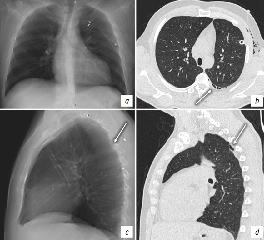 Рис. 4. Пациент М. a, c — рентгенограмма органов груди в прямой и левой боковой проекциях. КТ органов груди: b — аксиальная плоскость; d — сагиттальная плоскость, правый гемиторакс. Минимальная эмфизема ЭПП слева (стрелки). Дренажная трубка в левой плевральной полости.