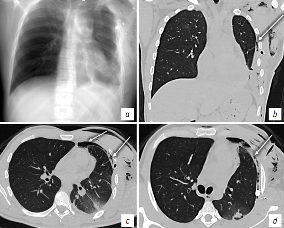Рис. 5. Пациент М. a — рентгенограмма органов груди в прямой проекции. КТ органов груди: b — фронтальная плоскость; c — аксиальная плоскость; d — косая плоскость через дренажную трубку. Эмфизема ЭПП слева (стрелки). Дренажная трубка в левом ЭПП.