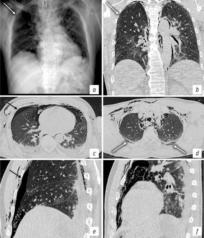 Рис. 6. Пациент М. a — рентгенограмма органов груди в прямой проекции. КТ органов груди: b — фронтальная плоскость; c, d — аксиальная плоскость на разных уровнях; e — сагиттальная плоскость через правый гемиторакс; f — сагиттальная плоскость через левый гемиторакс. Правосторонний пневмоторакс (черные стрелки). Пневмомедиастинум. Эмфизема ЭПП с обеих сторон (белые стрелки).