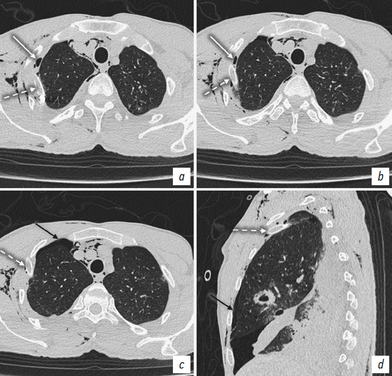 Рис. 7. Пациент Т. КТ органов груди: а–c — аксиальная плоскость на разных уровнях в краниокаудальном направлении; d — сагиттальная плоскость, правый гемиторакс. Правосторонний пневмоторакс (черные стрелки). Пневмомедиастинум. Эмфизема ЭПП справа (белые стрелки) с дренажной трубкой (пунктирные стрелки).