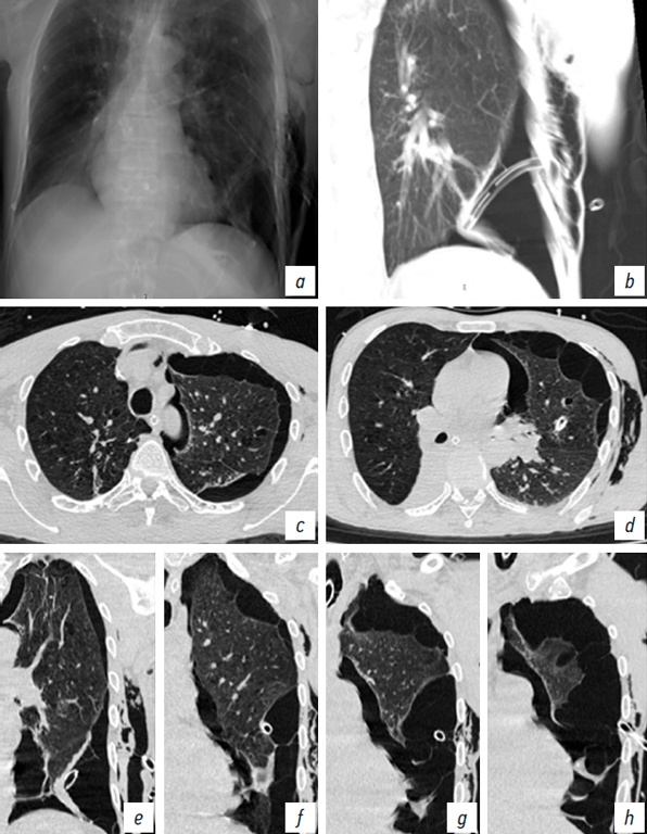 Рис. 8. Пациент У. a — рентгенограмма органов груди в прямой проекции. КТ органов груди: b — реконструкция во фронтальной плоскости с толщиной среза 5 см в режиме «Average»; c, d — аксиальная плоскость; e–h — фронтальная плоскость левый гемиторакс. Массивная эмфизема ЭПП слева. Дренаж в ЭПП слева, компримирующий легкое. Подкожная эмфизема слева.
