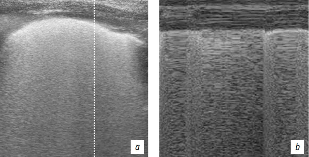 Рис. 9. Пациент А. УЗИ плевральной полости протокол «Blue»: а — B-режим; b — М-режим. Эмфизема ЭПП левого гемиторакса.