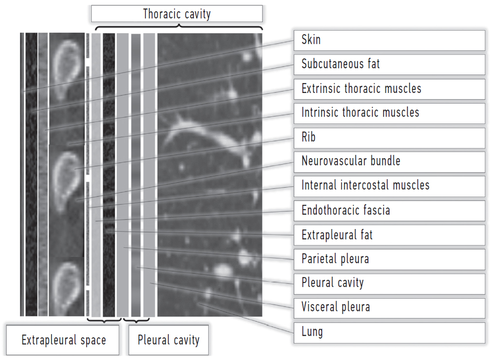 The extrapleural space (EPS; spatium extrapleuralis) is located between the inner surface of the ribs and the parietal pleura. Tissue dissection within this space is employed in thoracic surgery in the form of extrapleural pneumolysis for advanced-stage diseases of the lungs and pleura [1–3]. However, visualization of the EPS is challenging; its radiologic semiotics remain underdeveloped, and its anatomical features are often overlooked during chest computed tomography (CT) scan interpretation. Nevertheless, the EPS is crucial in diagnostic and therapeutic standpoints. Understanding the structure of this space, the pathological processes occurring within it, and its CT semiotics regarding injury facilitates optimal treatment planning. This article reviews the anatomy of EPS, the possibilities for its imaging under normal and certain pathological conditions, and the influence of radiologic findings on treatment strategy.