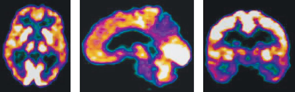 Рис. 2. БА, тяжелая деменция: выраженное нарушение метаболизма в теменных, височных долях, гиппокампах с обеих сторон, переднем и заднем отделах поясной извилины