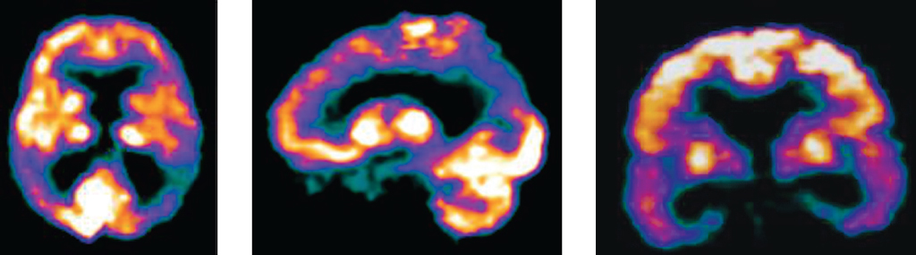 Рис. 1. БА, легкая деменция: нарушение накопления 18F-ФДГ в проекции теменных, височных долей, гиппокампов, заднего отдела поясной извилины