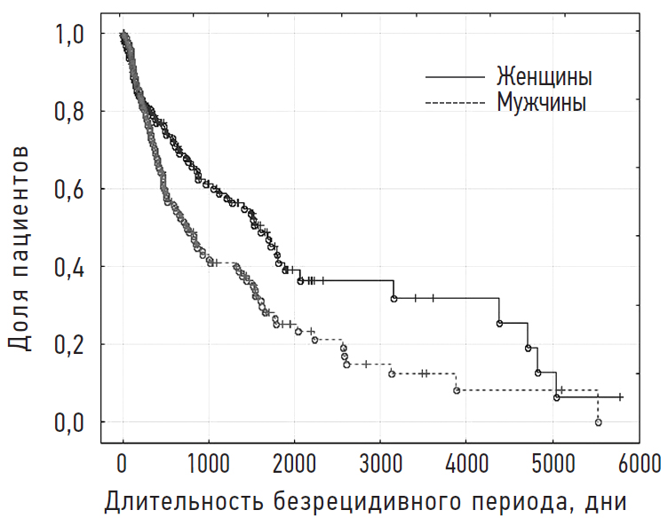 Как видно из представленных данных, у женщин наблюдаются более благоприятные исходы.
