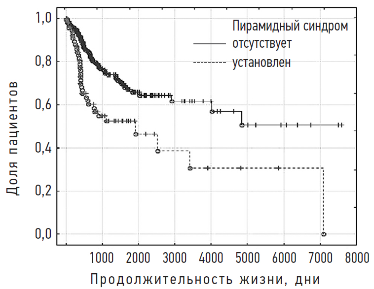 Наличие пирамидного синдрома является прогностически неблагоприятным фактором в отношении как длительности безрецидивного периода (анализ Каплана–Мейера p < 0,01), так и продолжительности жизни (анализ Каплана–Мейера p < 0,001) (рис. 3).