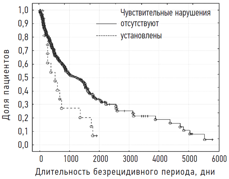 Нарушения чувствительности также являются прогностически неблагоприятным синдромом в отношении длительности безрецидивного периода (анализ Каплана–Мейера p = 0,045–0,12; 0,045 — Log Rank test; 0,12 — Gehan’s Wilcoxon test) (рис. 4), в меньшей степени тенденция прослеживается в отношении продолжительности жизни (анализ Каплана–Мейера p = 0,09–0,17; 0,9 — Gehan’s Wilcoxon test; 0,17 — Log Rank test).