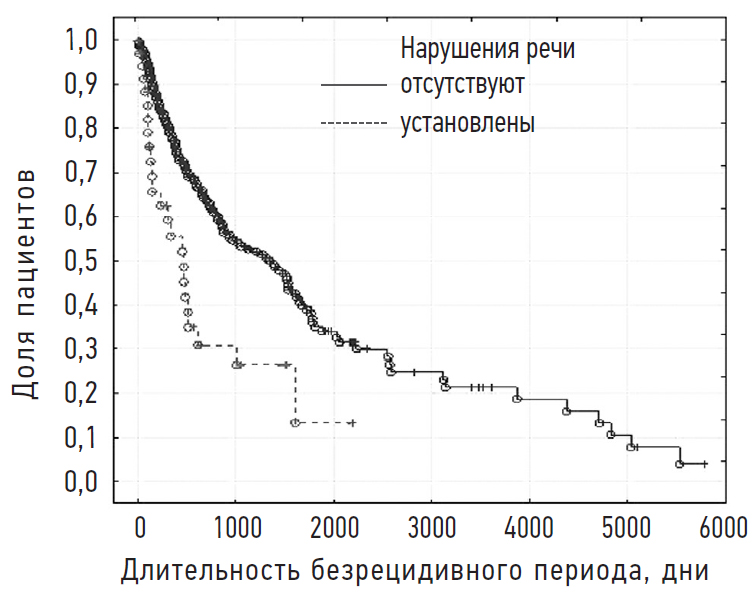 Fig. 5. Duration of the relapse-free period in patients with diffuse gliomas of the brain depending on the fact of speech disorders (p < 0.02 for the entire set of criteria)